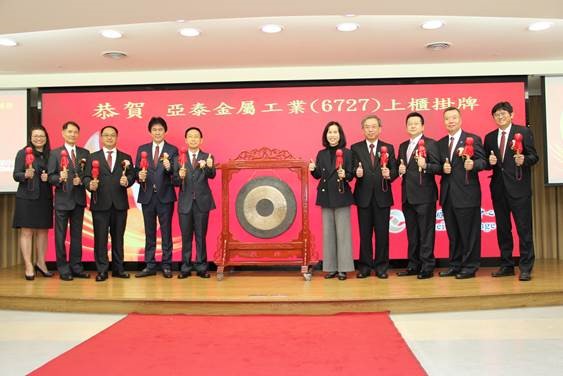 櫃買中心李愛玲總經理(右五)、華南永昌綜合證券李啓賢董事長(右四)、勤業眾信陳重成會計師(右三)、本公司鄒貴銓董事長(左五)、黃源財總經理(左四)、林澤銘董事(左三)、郭士堯副總(左二)、梁秀如財務長(左一)、江衍謙發言人/特助(右二)、莊英鈞特助(右一)共同進行敲鑼儀式。