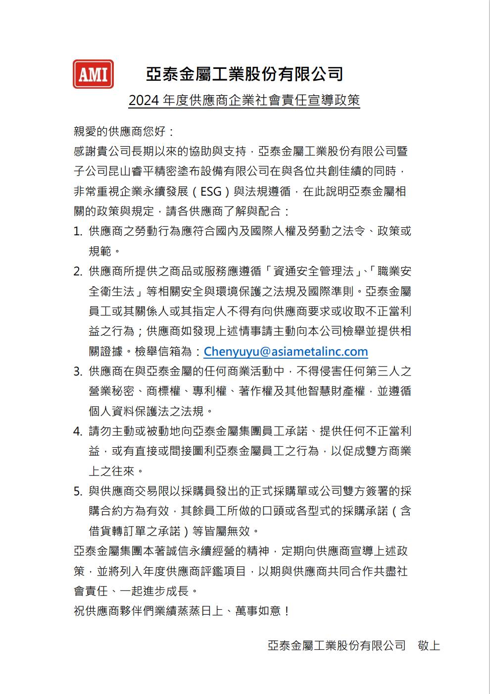 首页 最新消息 2024年度供應商企業社會責任宣導政策 評估採購行為對供應來源社區之環境與社會之影響,並與其供應商合作,共同致力落實企業社會責任。 訂定供應商管理政策,要求供應商在環保、職業安全衛生或勞動人權等議題遵循相關規範,於商業往來之前,評估其供應商是否有影響環境與社會之紀錄,避免與企業之社會責任政策牴觸者進行交易。 與其主要供應商簽訂契約時,其內容宜包含遵守雙方之企業社會責任政策,及供應商如涉及違反政策,且對供應來源社區之環境與社會造成顯著影響時,得隨時終止或解除契約之條款。