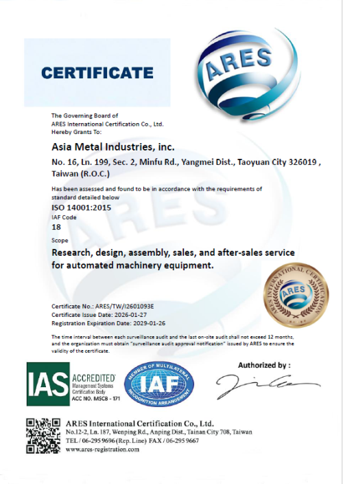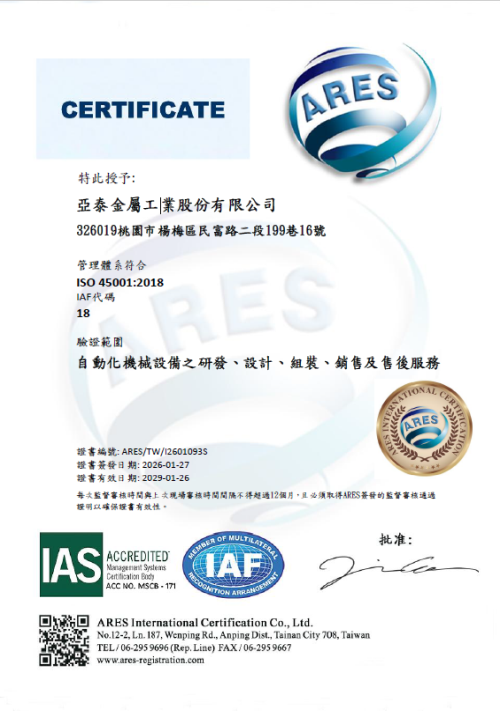 本公司 亞泰金屬工業股份有限公司 近日正式通過 ISO 14001 環境管理系統 及 ISO 45001 職業安全衛生管理系統之雙系統驗證,顯示本公司於環境保護、職業安全與健康管理,以及營運風險控管等面向,已建立完善且符合國際標準之管理制度。