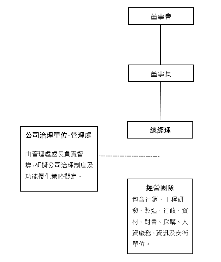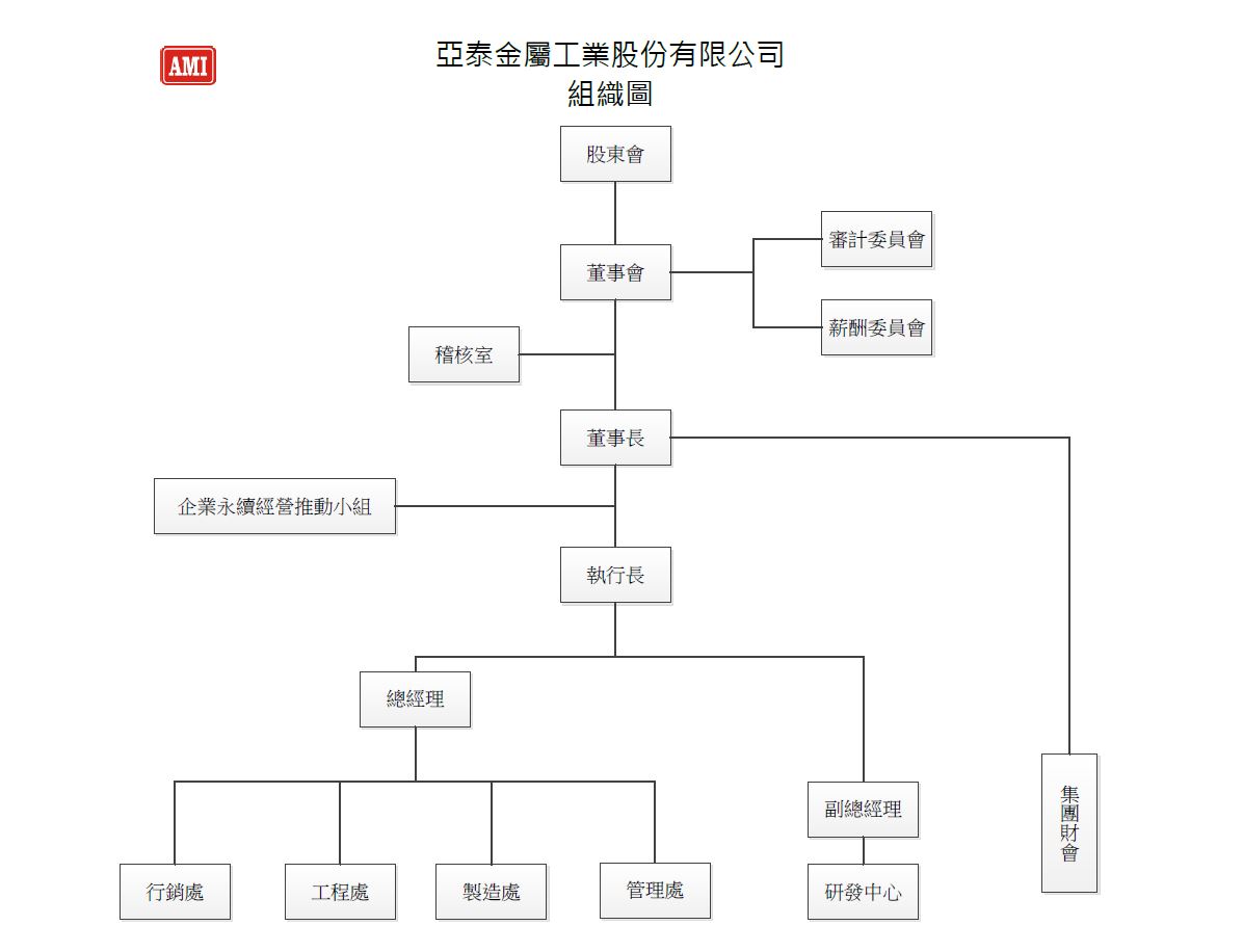 首頁 投資人專區 公司治理 公司治理架構及組織架構圖 公司治理架構圖 組織架構圖 各部門職掌 董事長室 公司長期經營發展策略之擬定。 執行董事會決議事項。 稽核室 總經理室 依據公司「內控循環、辦法」及相關法令之規定,規劃及執行年度稽核計畫,並出具稽核報告。 建立與維護公司內稽制度、衡量政策執行之效率並提供改善之建議。 保護公司資產,防止浪費、舞弊及無效率之情事發生。 各項例行性及專案性之稽核與異常事項之查報。 公司策略規劃、推動與督導。 公司中、短期之經營目標、方針、施行政策之擬定。 工程研發處 管理處 新產品研發專案之規劃、執行及研討。 協調各單位推動部門研發案。 協助並參與新技術之規劃及執行。 工程專案計畫之規劃、執行及掌控。 工程專案成本整理及提供。 專案圖面設計及發圖掌控。 工程設計文件的編制及流程改善。 標準化及模組化規劃及改善。 與客戶溝通有關工程、技術及其規範。 財務調度及分析、預算規劃及追蹤。 會計管理、成本控管、報表分析。 稅務之帳務處理。 管理辦法研擬、人力組織規劃。 薪酬考勤作業執行。 規劃執行行政總務、資產之管理作業。 行銷處 製造處 市場資訊、客戶產品與產業變化資料之分析與蒐集。 銷售計畫、策略及目標擬定與執行。 客戶關係管理、帳款管理及客訴追蹤與訂單管理。 專案進度規劃追蹤、製造出貨時程控管。 提升製程順暢度。 實際生產流程之控管。 生產、外包作業及外包廠商管理。 負責執行公司一切原材物料採購相關作業。 執行生產排程,依訂單製造。